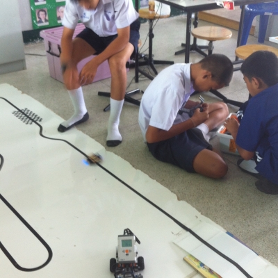 อบรมนักเรียนโรงเรียนเทศบาลวัดกำแพงเรื่องการควบคุมหุ่นยนต์อัติโนมัติวิ่งตามเส้น