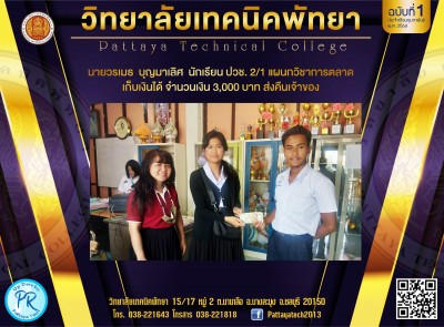 64 02 02 นายวรเมธ บุญมาเลิศ นศ ปวช 21 แผนกการตลาด เก็บเงินได้ จำนวนเงิน 3,000 บาท ส่งคืนเจ้าของเงิน