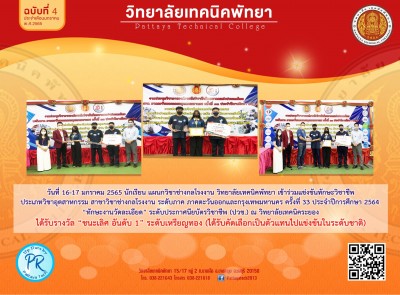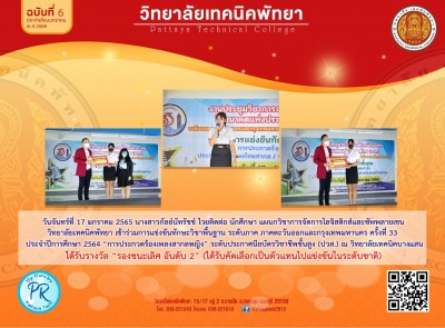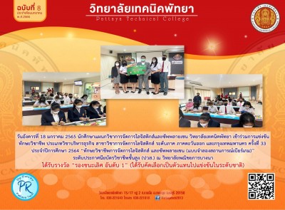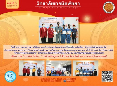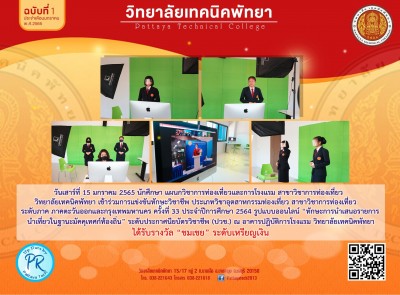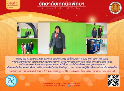 65 01 16 ผลการแข่งขันทักษะวิชาชีพ ประเภทวิชาอุตสาหกรรมการท่องเที่ยว สาขาวิชาการท่องเที่ยว ระดับภาค ภาคตะวันออกและกรุงเทพมหานคร ครั้งที่ 33 ประจำปีการศึกษา 2564 ทักษะการจัดทำรายการนำเที่ยว ระดับ ปวส ณ อาคารปฎิบัติการโรงแรม วิทยาลัยเทคนิคพัทยา
