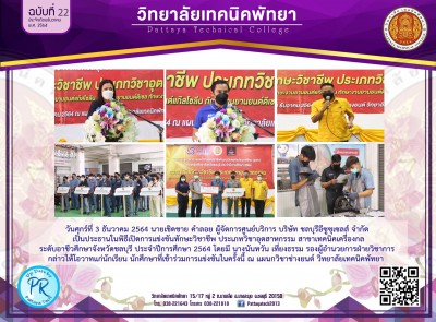 64 12 16 ผลการแข่งขันทักษะวิชาชีพ แผนกวิชาอุตสาหกรรมการท่องเที่ยว สาขาวิชาการท่องเที่ยว ระดับอาชีวศึกษาจังหวัดชลบุรี ประจำปีการศึกษา 2564 การนำเสนอรายการนำเที่ยวในฐานะมัคคุเทศก์ท้องถิ่น ณ วิทยาลัยอาชีวศึกษาชลบุรี