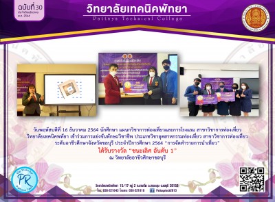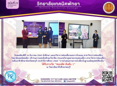 64 12 16 ผลการแข่งขันทักษะวิชาชีพ แผนกวิชาอุตสาหกรรมการท่องเที่ยว สาขาวิชาการท่องเที่ยว ระดับอาชีวศึกษาจังหวัดชลบุรี ประจำปีการศึกษา 2564 การจัดทำรายการท่องเที่ยว ณ วิทยาลัยอาชีวศึกษาชลบุรี
