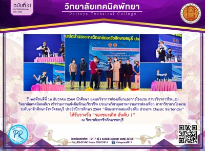 64 12 16 ผลการแข่งขันทักษะวิชาชีพ แผนกวิชาอุตสาหกรรมการท่องเที่ยว สาขาวิชาการโรงแรม ระดับอาชีวศึกษาจังหวัดชลบุรี ประจำปีการศึกษา 2564 ทักษะการผสมเครื่องดื่มประเภท Classic Bartender ณ วิทยาลัยอาชีวศึกษาชลบุรี