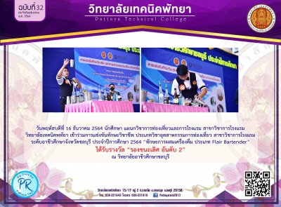 64 12 16 ผลการแข่งขันทักษะวิชาชีพ แผนกวิชาอุตสาหกรรมการท่องเที่ยว สาขาวิชาการโรงแรม ระดับอาชีวศึกษาจังหวัดชลบุรี ประจำปีการศึกษา 2564 ทักษะการผสมเครื่องดื่มประเภท Flair Bartender ณ วิทยาลัยอาชีวศึกษาชลบุรี