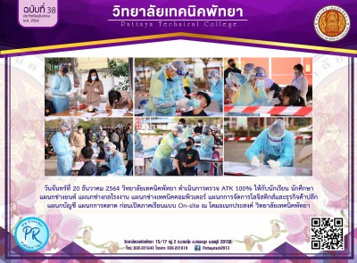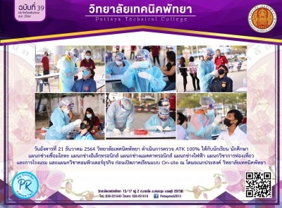 64 12 20 วิทยาลัยเทคนิคพัทยา ดำเนินการตรวจ ATK 100% ให้กับนักเรียน นักศึกษา แผนกช่างยนต์ แผนกช่างกลโรงงาน แผนกเทคนิคคอมพิวเตอร์ แผนกการจัดการโลจิสติกส์และธุรกิจค้าปลีก แผนกบัญชี แผนกการตลาด ก่อนเปิดภาคเรียนแบบ On-site ณ อาคารโดมเอนกประสงค์ วิทยาลัยเทคนิคพัทยา